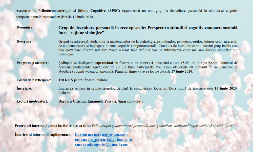 Întrerupem programul obișnuit pentru a vă propune un nou grup de dezvoltare personală în paradigmă Cognitiv-Comportamentală, detaliile le aflați din coloratul afiș ori dacă mă contactați direct.